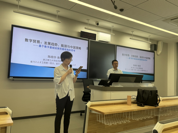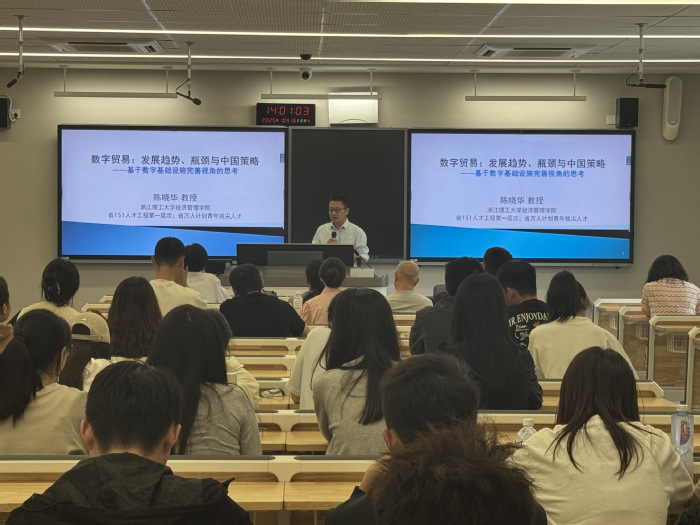 2025年10月16日下午2点,湖州学院经济管理学院国际经济与贸易系在5号楼(301-302)教室举办“数字贸易:发展趋势、瓶颈与中国策略——基于数字基础设施完善视角的思考”专题学术讲座。本次讲座特邀浙江理工大学经济管理学院教授、国家一流专业国际经济与贸易专业负责人陈晓华担任主讲人,国贸系部分教师及2025级国贸专升本学生共百余人参加。