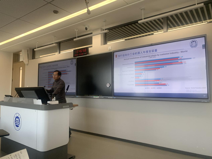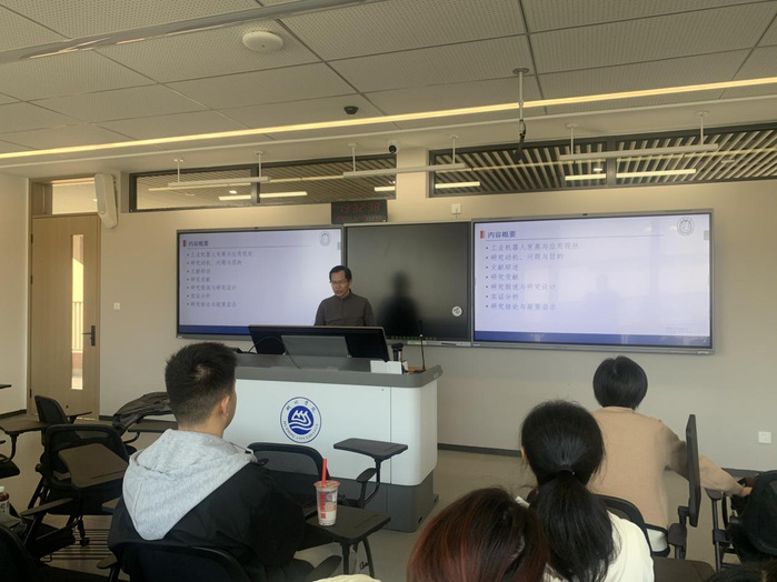 何教授首先从“十四届全国人大二次会议”提出的“增强产业链供应链韧性和竞争力”这一国家战略背景切入,引出了本次讲座的核心议题:在复杂的国际经贸环境下,中国制造业企业如何利用工业机器人这把“智能钥匙”,打开出口多元化的大门,从而稳定下游供应链,抵御外部风险。讲座中,何教授详细解读了其团队基于2000-2014年中国工业企业与海关数据的实证研究成果。何教授的讲解细致入微,不仅揭示了工业机器人促进出口多元化的内在逻辑,还提出了很多具有创新性的观点和结论。这些洞见让在场的师生们对智能制造与国际贸易的交叉领域有了全新的认识。
