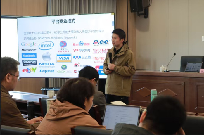 讲座中,桂教授以全球头部企业的发展为切入点,系统阐释了平台商业模式的核心逻辑。他指出,平台模式正在深刻重构传统产业价值链,其成功关键主要在于两大理论基石:双边(多边)市场与网络外部性。通过淘宝、京东、拼多多、360杀毒、微信等典型案例,桂教授生动解析了平台如何运用“倾斜式定价”策略(如对消费者免费、向商家收费)吸引用户,并借助一方用户的增长来吸引另一方,形成强大的网络效应。