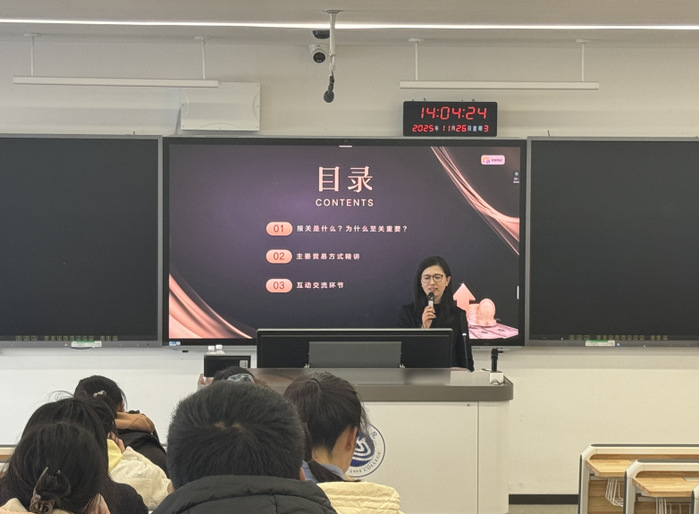 聘任仪式结束后,谈英导师以“破壁与链接:新外贸时代下的进出口报关”为题开展专题讲座。她从“身边的报关”切入,生动阐释了报关作为国际贸易“合规钥匙”与“数据枢纽”的核心价值,拆解一般贸易“申报-审单-征税-查验-放行”五大流程要点。同时针对保税物流中心(B型)等新兴业态,讲解其“链接全球市场”的运作机制与效率优势。