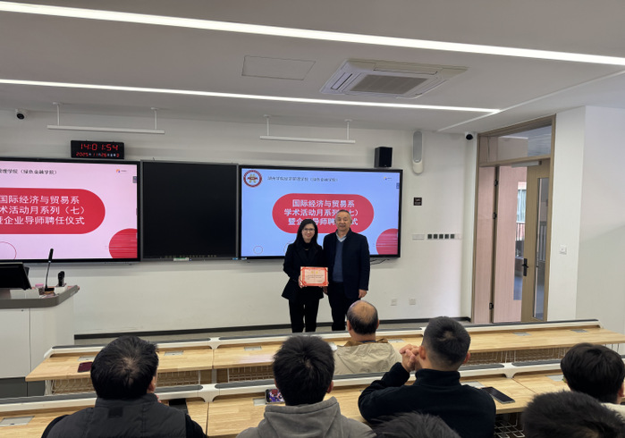 2025年11月26日下午,湖州学院经济管理学院(绿色金融学院)国际经济与贸易系在6号楼219-220教室成功举办企业家进校园讲座活动暨企业导师聘任仪式。活动由国际经济与贸易专业负责人梁会君主持,学院党委副书记宁培龙、湖州浙北报关行负责人谈英出席,系部师生代表近90人现场参与,共同见证校企协同育人新进展。